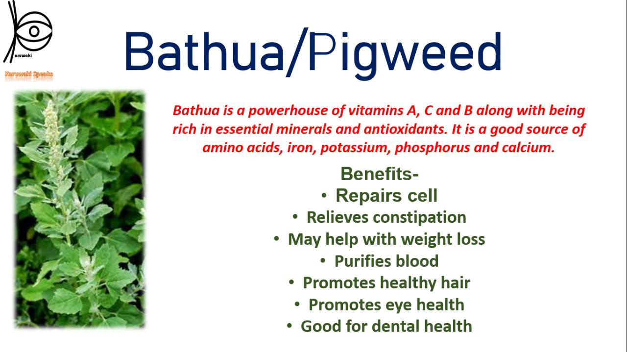 Bathua/pigweed or Chenopodium Album is closely related to Quinoa (Chenopodium Quinoa) its leaves are eaten in various forms mixed in saag, raitas, rotis especially in winters. Bathua is a powerhouse of vitamins A, C and B along with being rich in essential minerals and antioxidants. It is a good source of amino acids, iron, potassium, phosphorus and calcium.